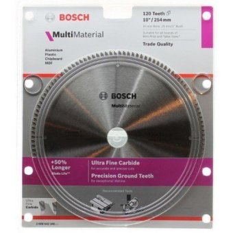 รายละเอียดของสินค้า BOSCH ใบเลื่อยวงเดือน 10 120ฟัน BOSCH ใบเลื่อยวงเดือน 10 120ฟัน Features - Bosch Aluminium Multi Material Circular Saw Blade 254mm (10 Inch) 120 Teeth - Ultra fine carbide teeth for accurate and precise cuts - Precision ground carbide tips for a smoother cutting surface providing an ultra clean consistent finish - Hardened and tempered steel body - Trade quality - Exceptional life - Specially suitable for cutting aluminium, laminated chipboard and epoxy plastics - 254mm (10 ) outer diameter - 30mm bore size - Complete with 16mm, 20mm, 25mm and 1 bushes (reduction rings) - 120 teeth for a clean cut - Suitable for all brands of Mitre and Bench Saws (please check sizes and dimensions of your machine) - Maximum 6000 RPM - Pack of one blade Specially suitable for cross clean cuts in: - Aluminium non-ferrous metals - Plastics epoxy - Parquet - Cement-bonded fibre boards - Laminated chipboard Suitable for cutting: - Thick wood - Soft hard wood - Chipboard